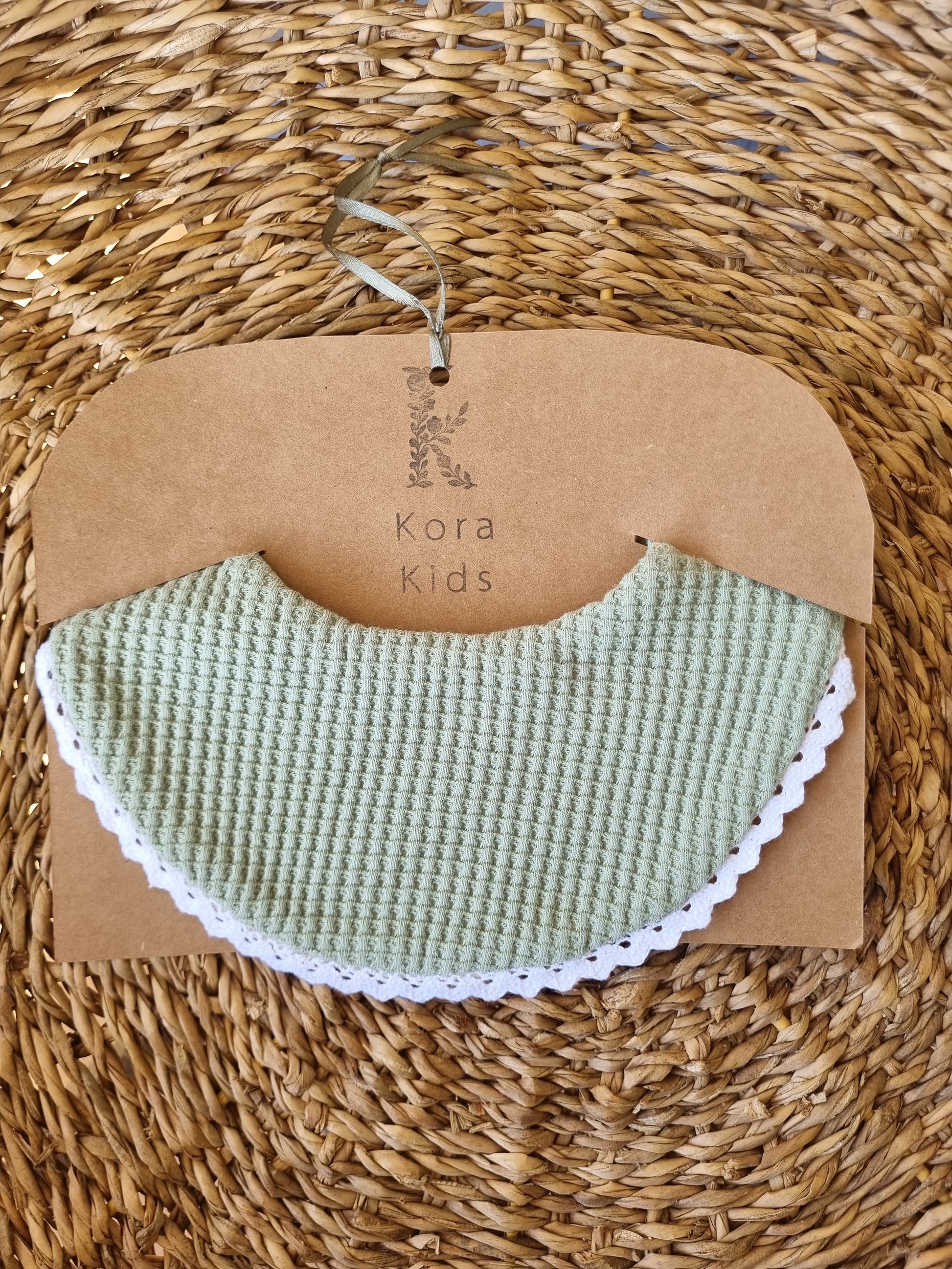 Babero 100% algodón peruano y hecho a mano. Es doble (tela waffle por un lado y franela por el otro) lo que lo hace muy absorbente.
