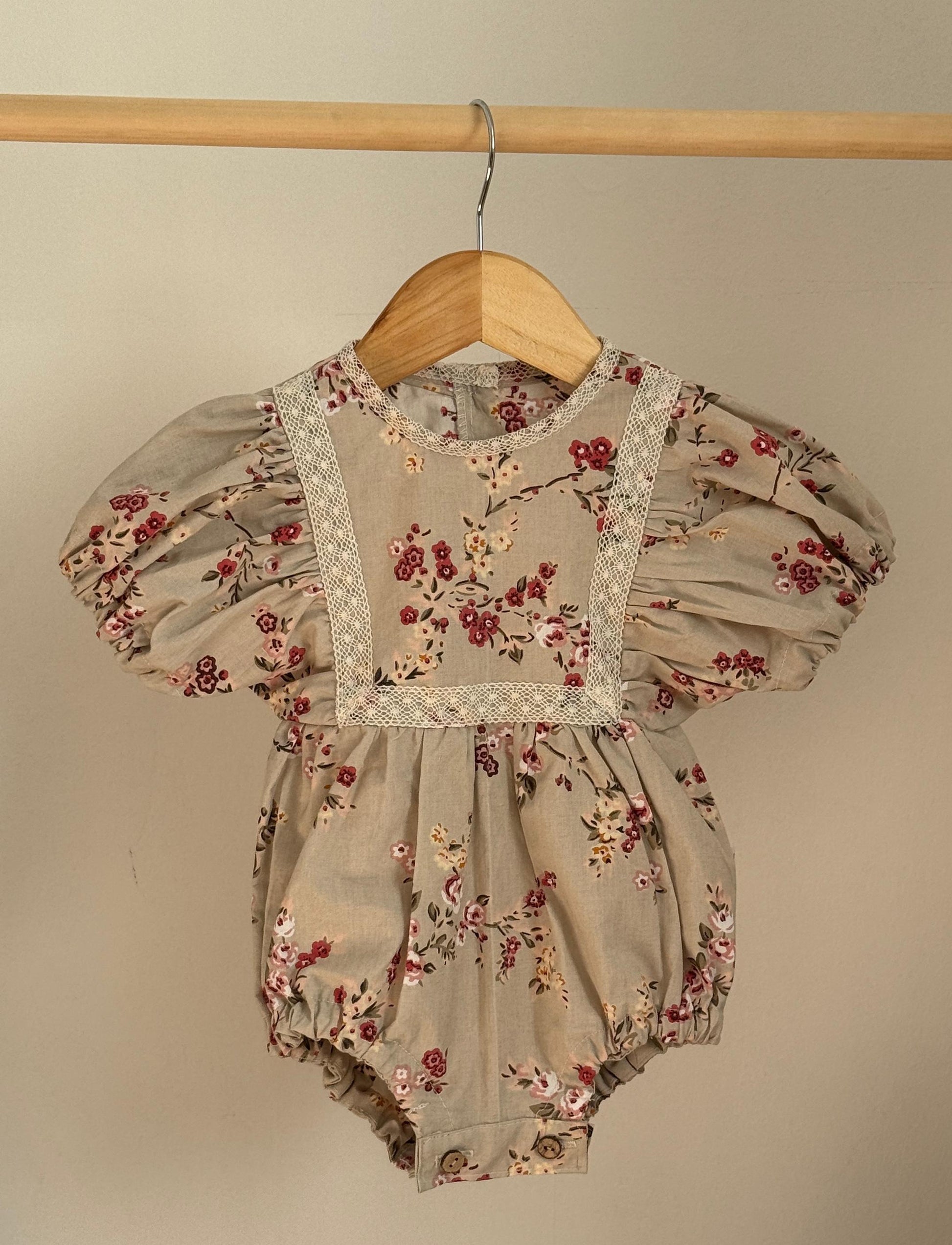 Bombacho manga corta muselina 100% algodón peruano. Aplicación de bolillo en la parte delantera y botones en la parte inferior.