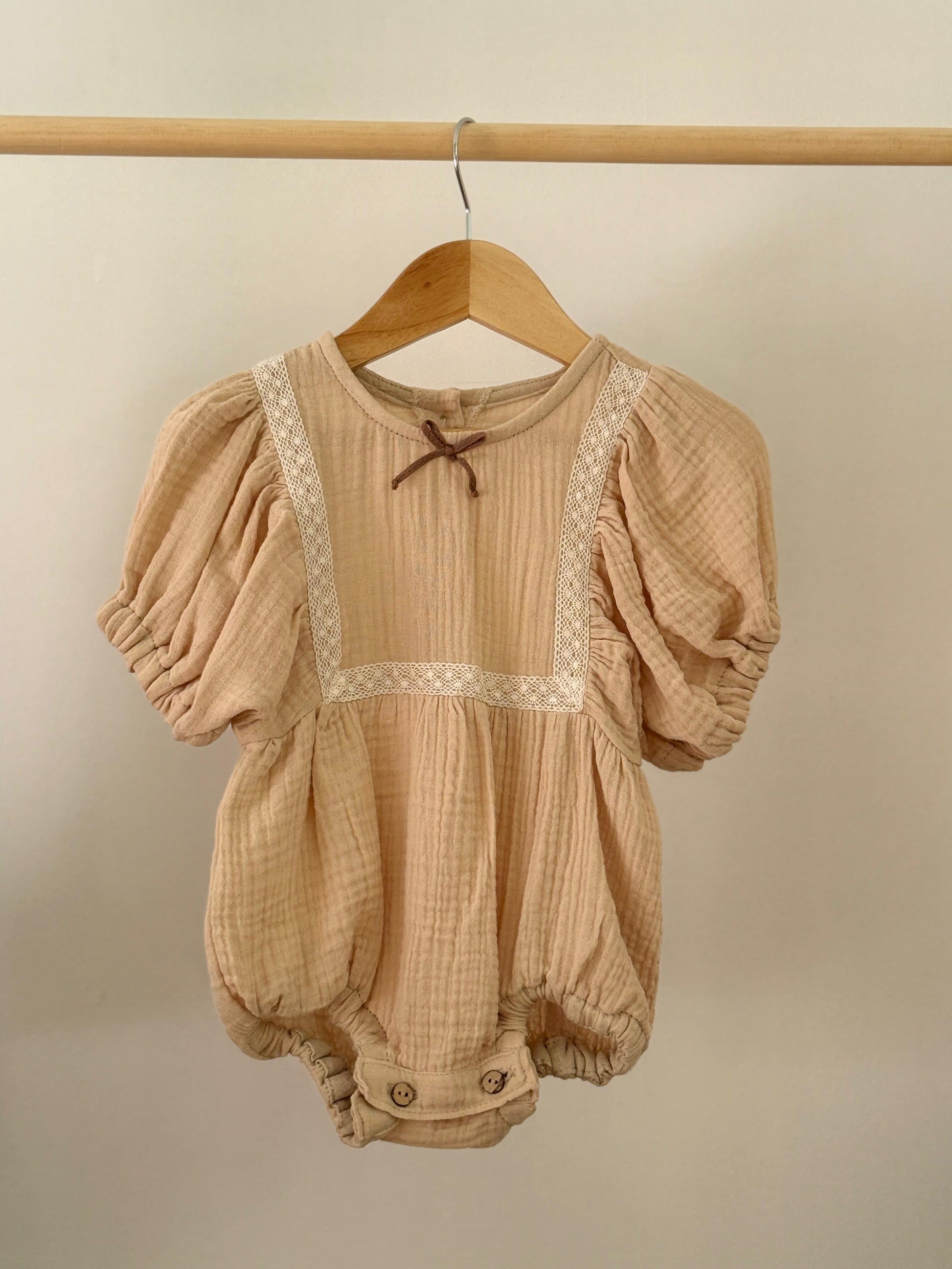 Bombacho manga corta muselina 100% algodón peruano. Aplicación de bolillo en la parte delantera y botones en la parte inferior.