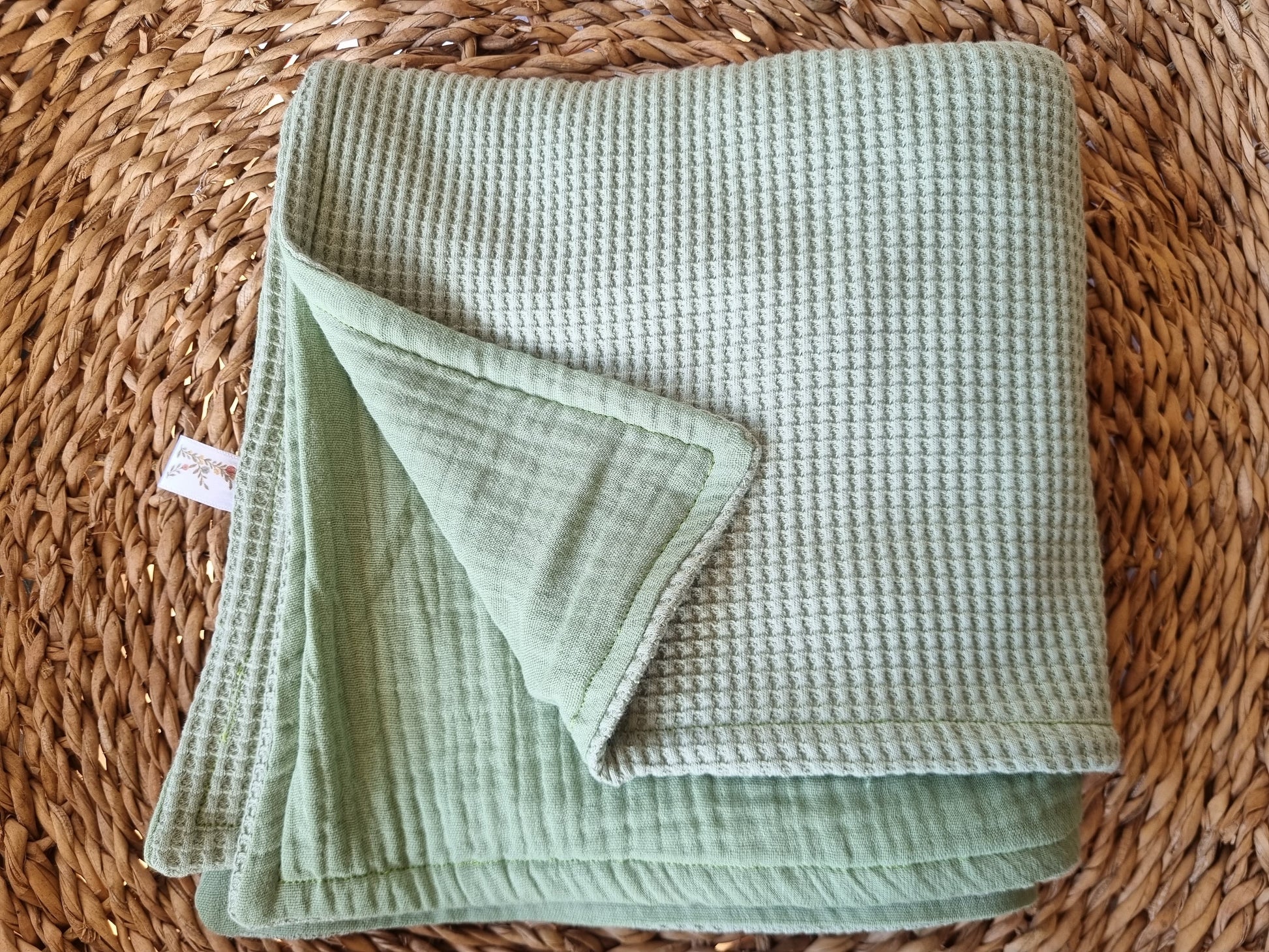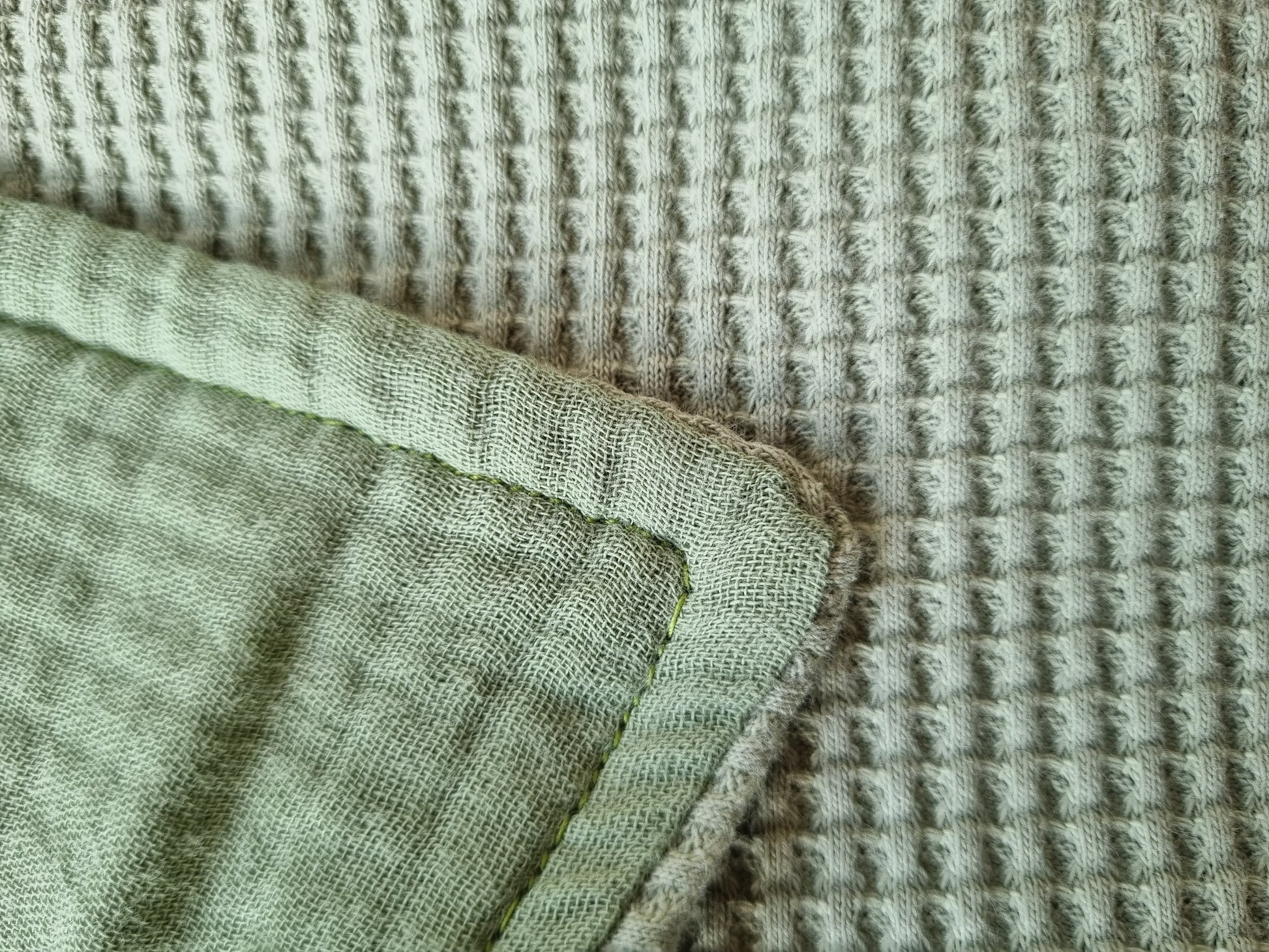 Tela waffle por un lado y muselina por el otro.