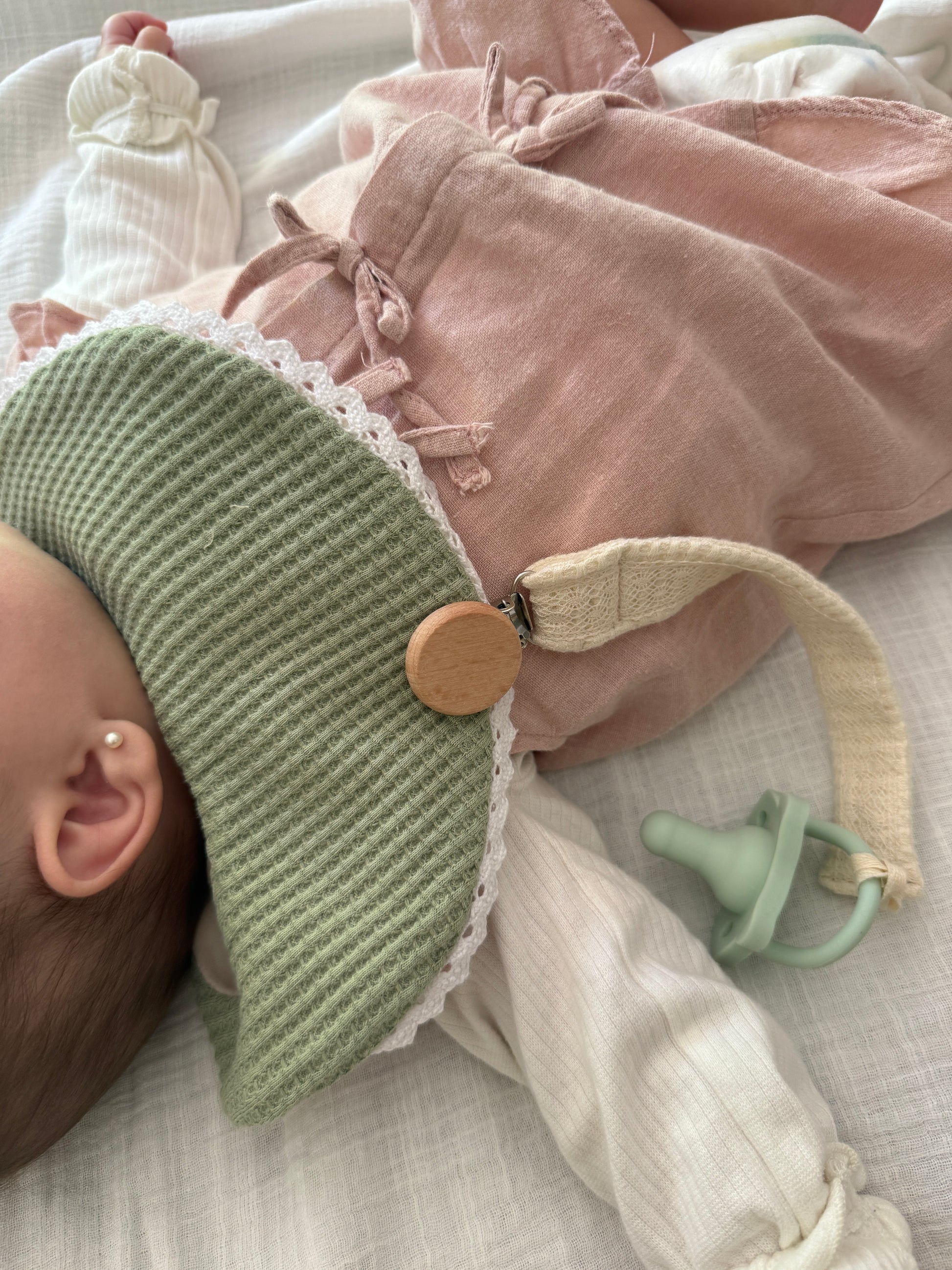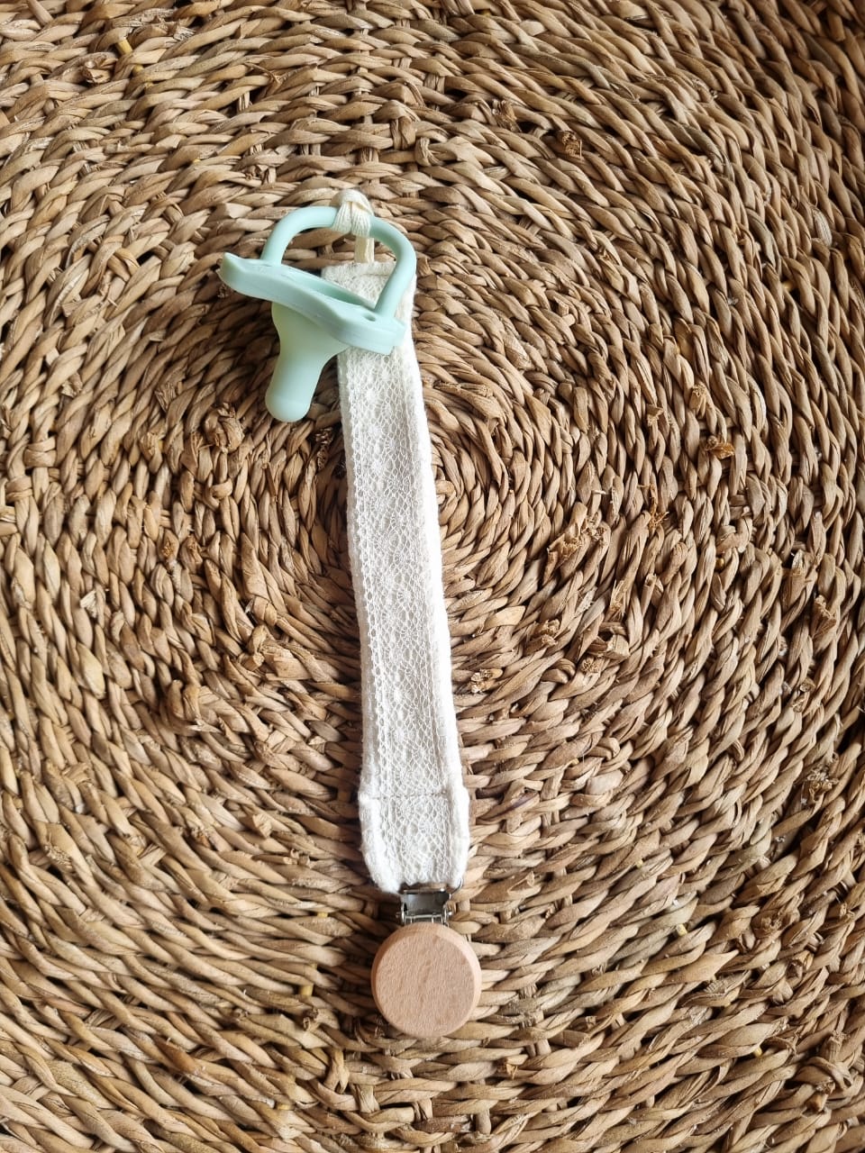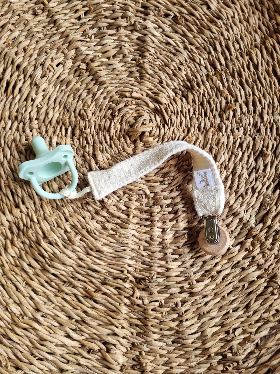 Portachupete 100% de algodón con detalle de bolillo blanco.